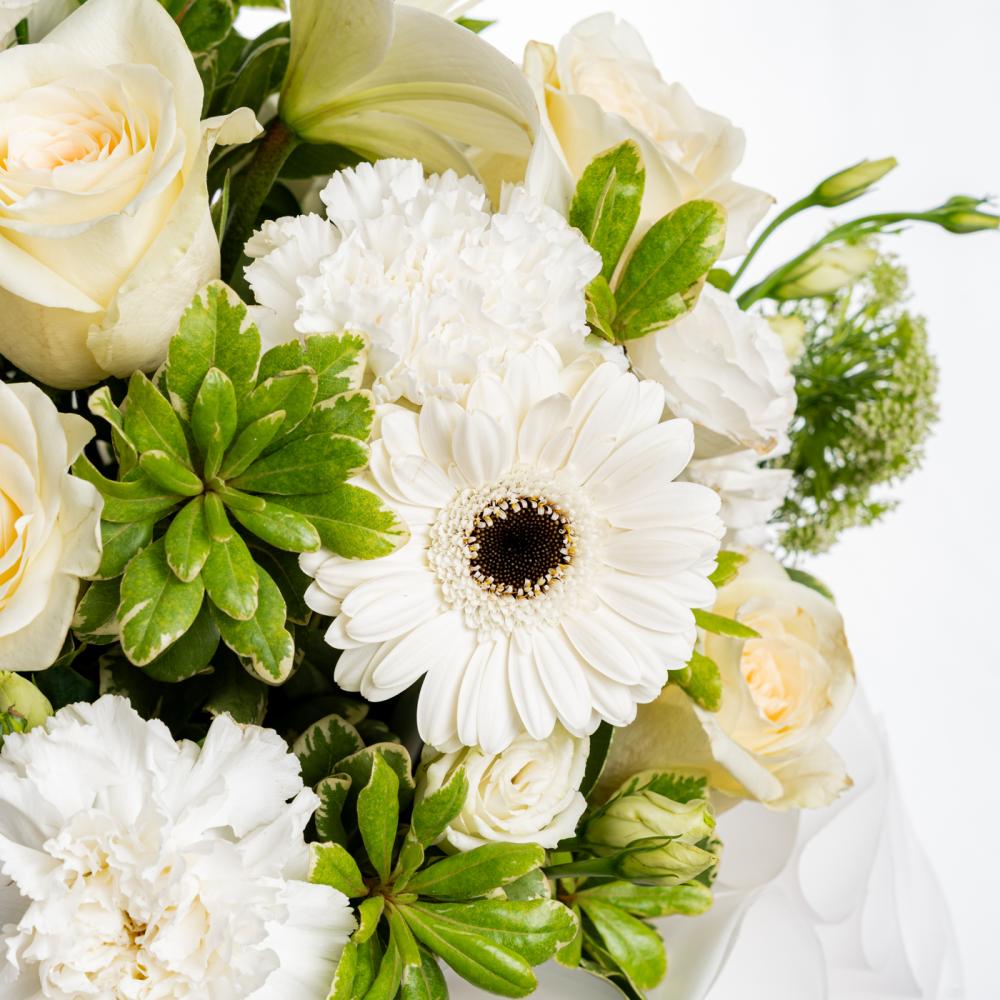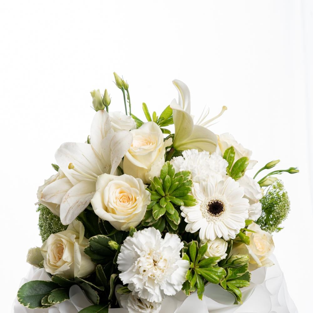 هدية مميزة من الجوري والجربيرا البيضاء تعبّر عن الصفاء والرقي بلمسة طبيعية.